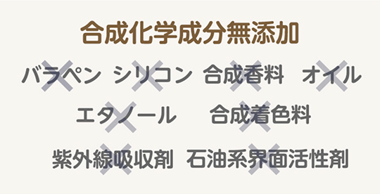 ※パラベン、シリコン、合成香料、紫外線吸収剤、石油系界面活性剤、合成着色料、オイル、エタノール